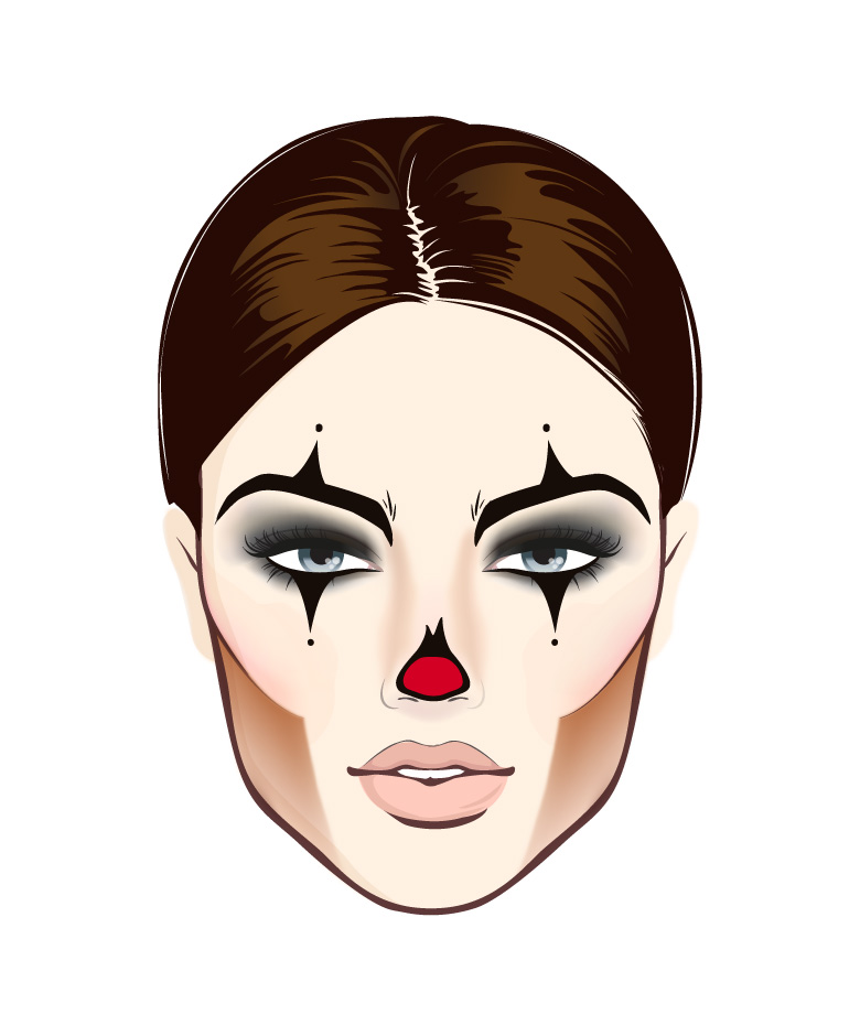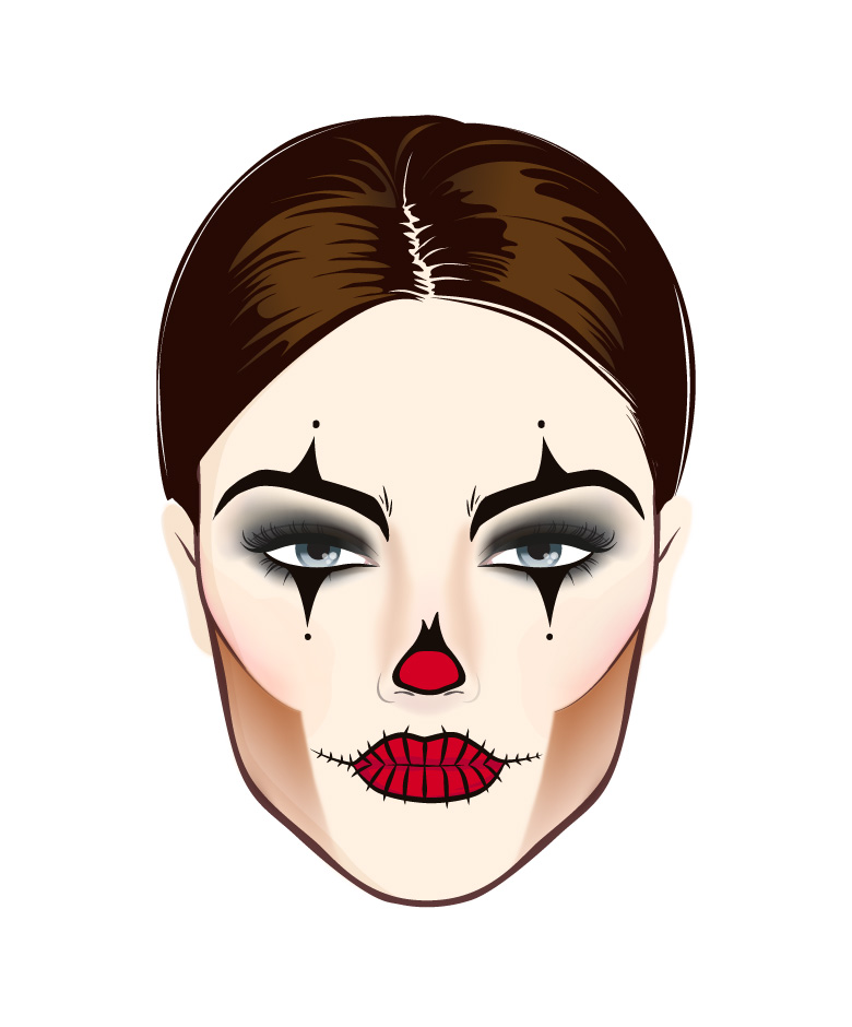 De vrolijke rode clownsneus krijgt in deze look een creepy zwart randje! Gebruik je de rode lipstick die straks ook op je lippen gaat en maak daarmee het puntje van je neus rood. Pak vervolgens opnieuw de vloeibare eyeliner en kleur een zwarte rand om je rode neuspunt. Hou het smaller dan je eigen neus, zodat de hele tekening óp en niet aan de zijkant van je neus ligt.