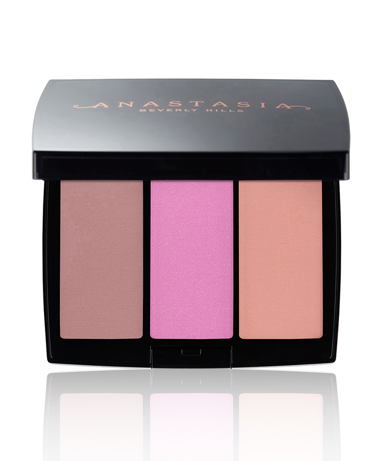 Creëer een gezonde glow met het Make-up Blush Trio ’03 Peachy Love’ van Anastasia Beverly Hills. Breng de lichtste kleur (de highlighter) aan in het midden van je voorhoofd en kin, op de lengte van je neus en aan de bovenkant van je jukbeenderen. De roze tint (de blush) komt op je jukbeenderen.