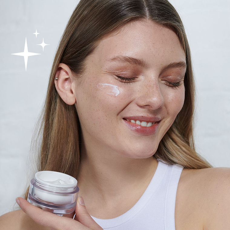 Als je huid droog en ruw aanvoelt, is dat een teken van dehydratatie. Het is belangrijk om een moisturizer te kiezen die hyaluronzuur bevat, voor een gezonde en gehydrateerde huid. Het houdt je huid soepel en elastisch én fijne lijntje en rimpels verminderen. Breng de crème over je hele gezicht aan en laat hem 5 minuten intrekken voor een optimaal effect.